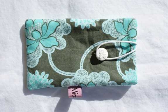 Lukkes med en hvit elastisk snor og en koselig hvit knapp med blomster.