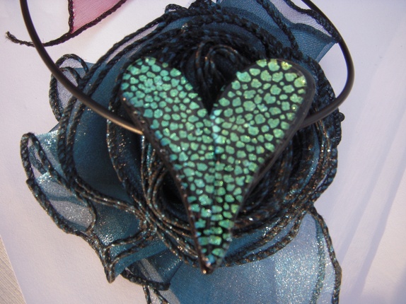 Håndskjært glasshjerte som har grønne prikker på sort bunn. Røroppheng bak i kobber som er forsølvet. Smykket er 5 cm langt og 4,5 cm bredt. Helt unikt.