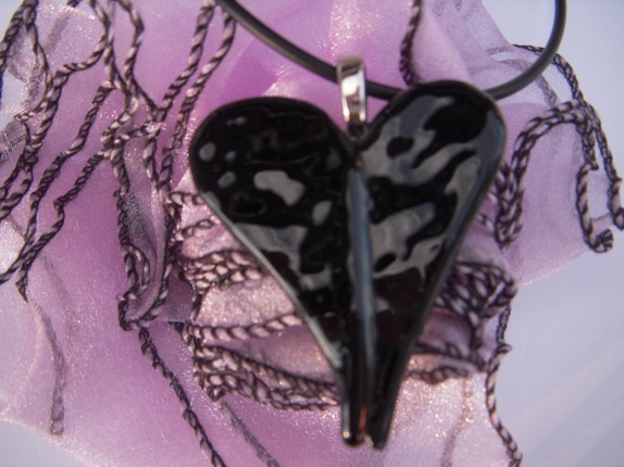 Sort glasshjerte, unikt. 5 cm langt og 4 cm bredt.Kjede ekstra, kr 98,-