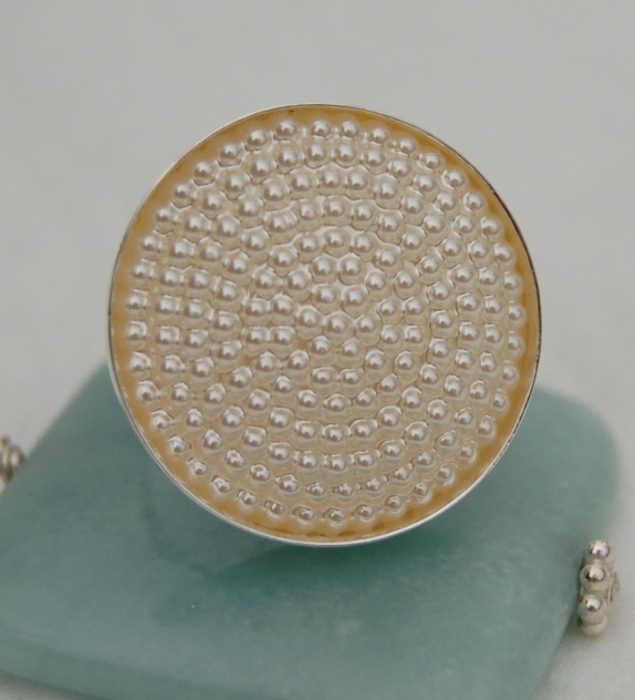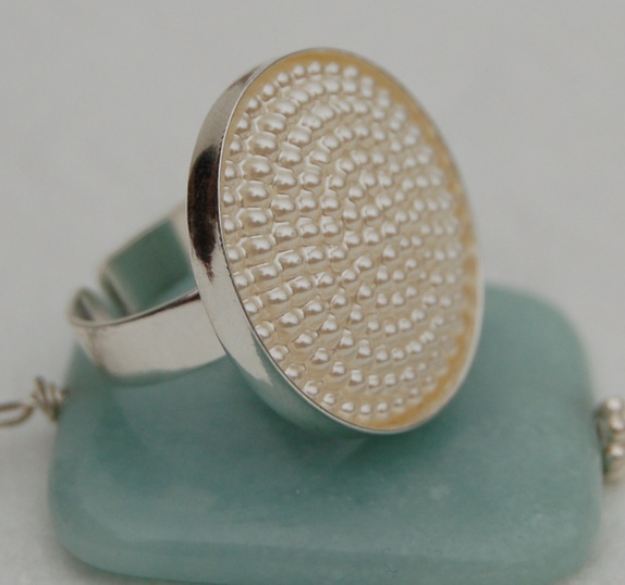 Morsom stor ring med vinage akryl cabochon i en søvfarget messing setting. Ringen ser ut som den består av mange små perler. Ringen er regulerbar.25 mm i diameter.