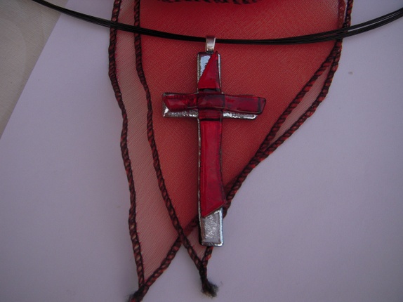 Håndlaget kors i smykkeglass, skjevt og unikt. 6,5 cm langt og 3 cm bredt.