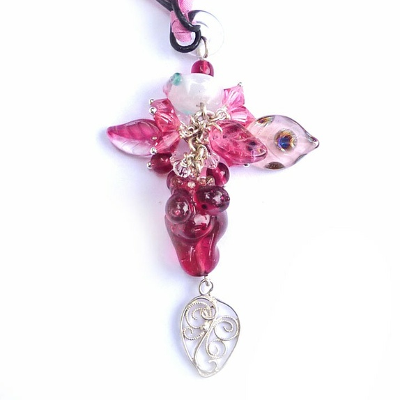 Jeg lager selv både gudinnene og lampworkperlene, og denne leveres med både silkesnor og lærreim så du kan velge hva du vil bruke... eller begge.