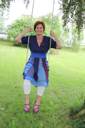 Denne kjolen har jeg redesignet fra strikka gensere og andre strikka plagg som jeg har klippet opp i remser og biter og sydd sammen med utvendig/synlig overlock søm.