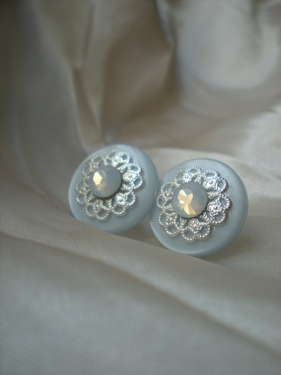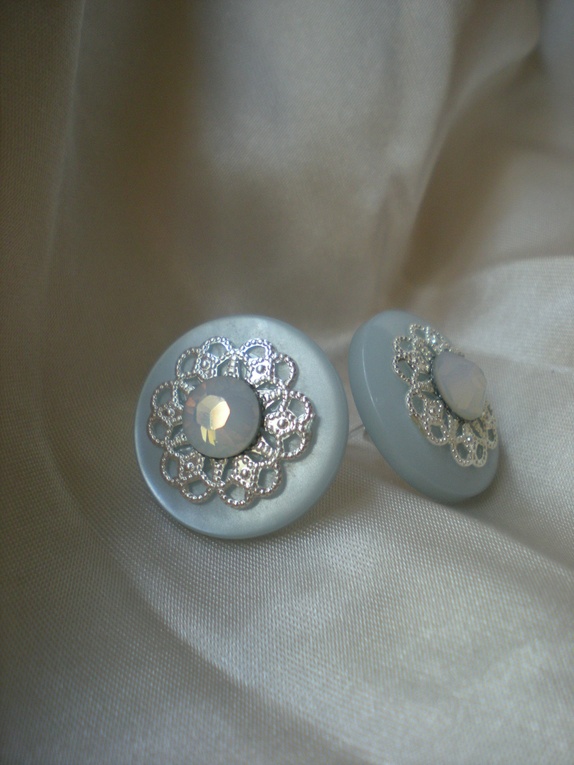 Lysblå øredobber med sølvfarget pynt og hvite, glitrende swarovski-stener.