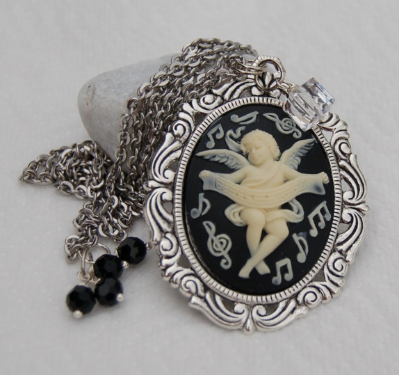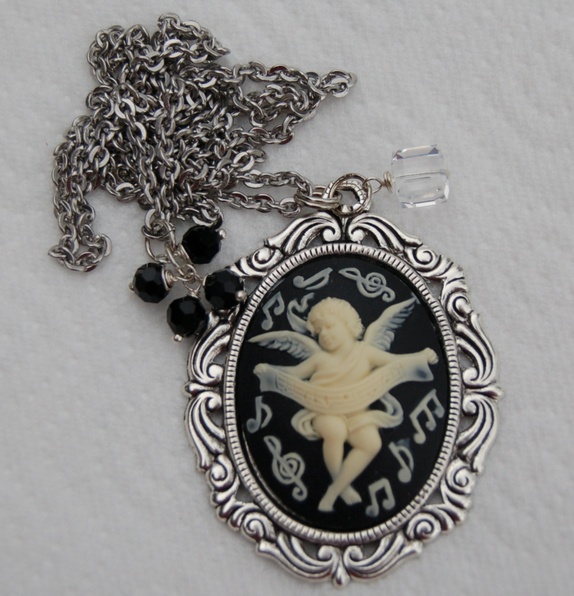 Kamésmykke i sølvfarget messig med englemotiv. Cabochonen er svart med kremfarget utsmykking. Nydelig swarovski kube (8mm) og tre små krystaller henger på. Kjedet er 57 cm, men kan forkortes eller forlenges om ønskelig. Anhenget er 6 x 4,5 cm.