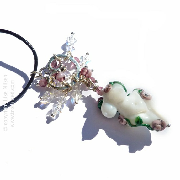 Jeg lager selv både gudinnene og lampworkperlene, og denne leveres med både silkesnor og lærreim så du kan velge hva du vil bruke... eller begge.
