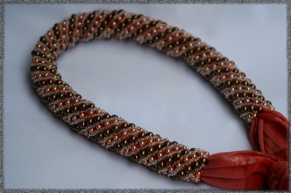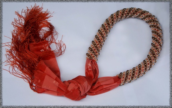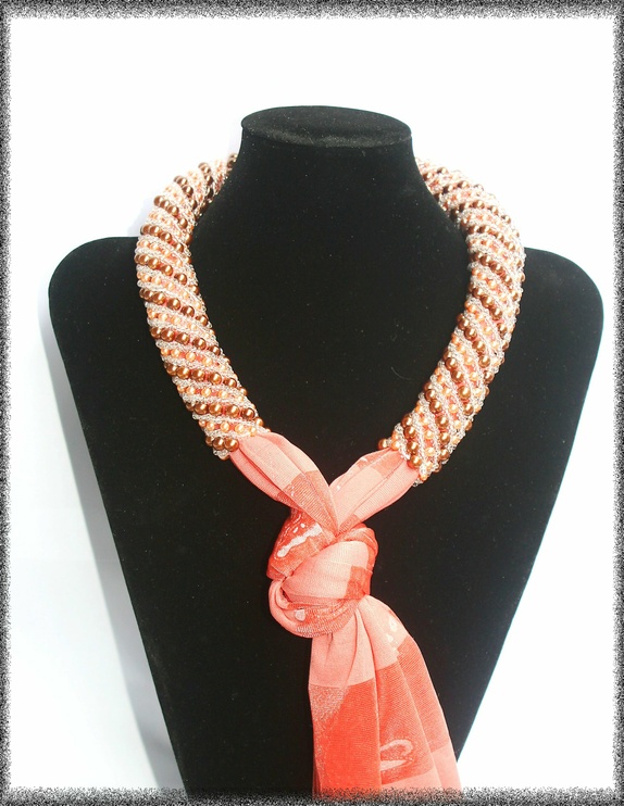 En halskjede laget av tsjekkiske glassperler. Smykket er massivt, men ikke tungt. Sjalet kan knyttes på forskjellige måter. Selve smykkedelen er 45 cm lang.