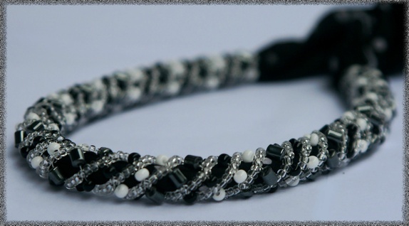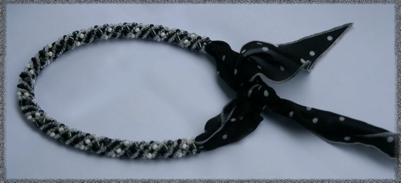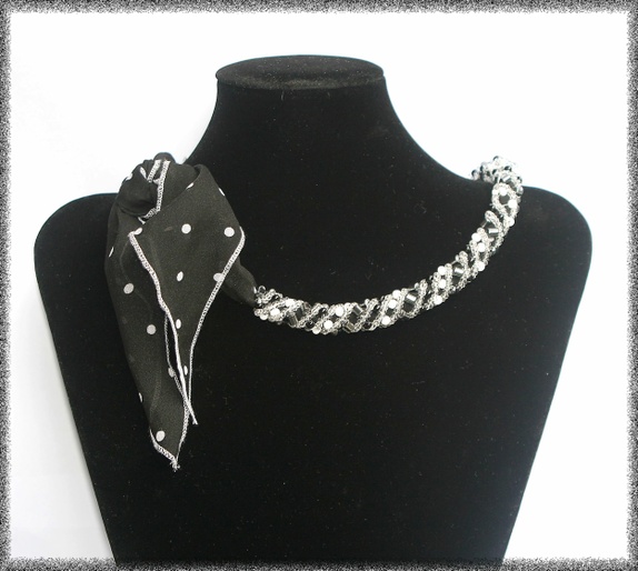 En halskjede laget av tsjekkiske glassperler. Sjalet kan knyttes på forskjellige måter. Selve smykkedelen er 36 cm lang.