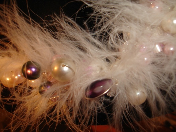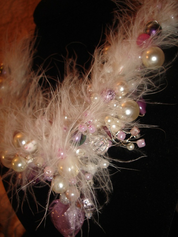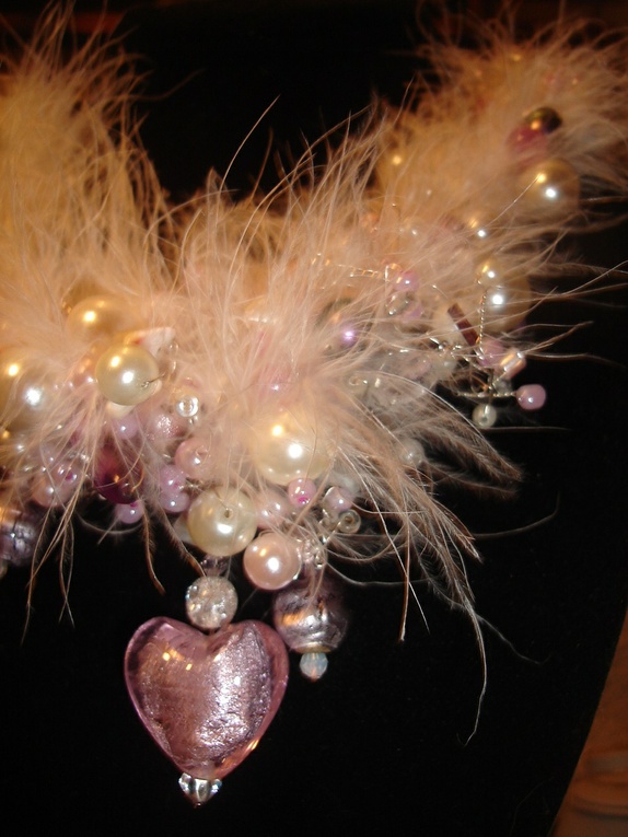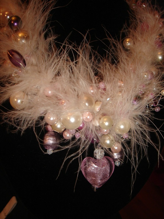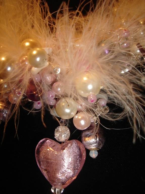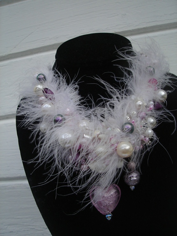Bruker farga tinntråd, effektgarn, fiskesene til å sy med, wire, vokset bomulltråd, lær, små kjettinger, knapper, støper ansiktsanheng i gips og bruker fimoleire i noen. ALLE SMYKKENE ER UNIKE..