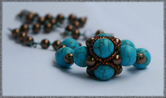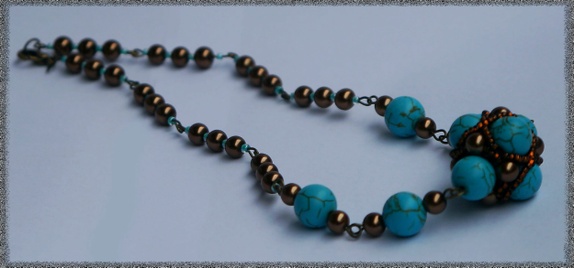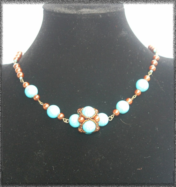 Halskjede laget av ekte turkis, tsjekkiske glassperler og metall pinner. 32 cm i lengden.
