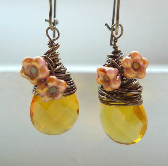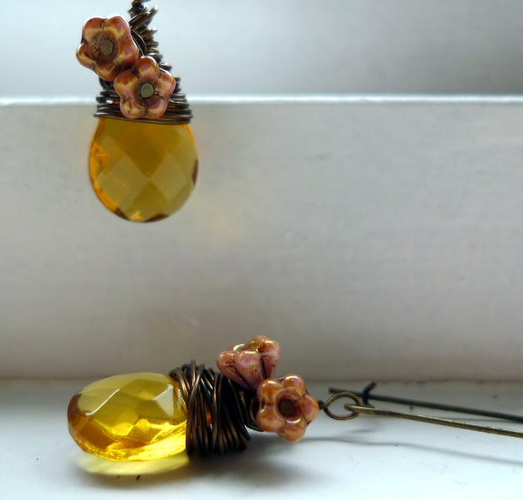 Laget med gyllengule havkrystaller, yndige små tsjekkiske blomster og nikkelfri messing. Øredobbene måler litt over 5 cm fra topp til tå.