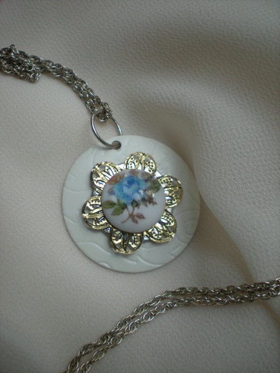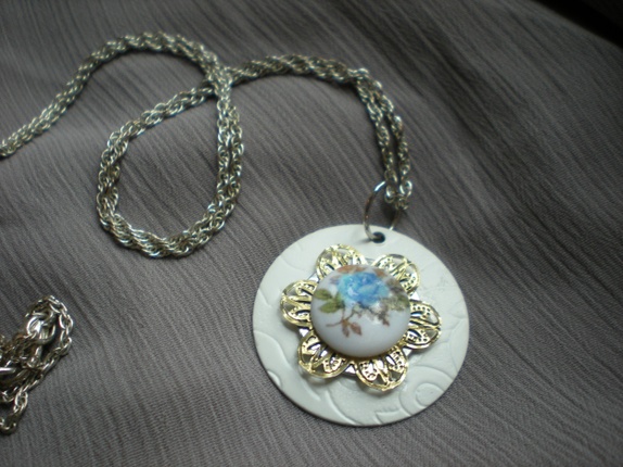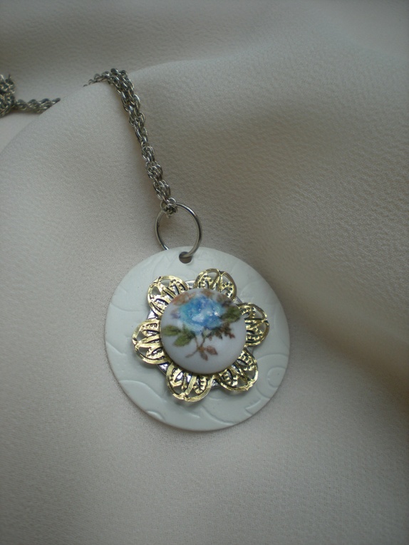 Søtt, sirkelformet halssmykke bestående av hvit-farget metallplate, en mindre sølvfarget metallplate, gull-farget blomst og porselen-knapp med blå blomst.