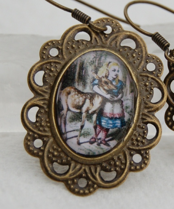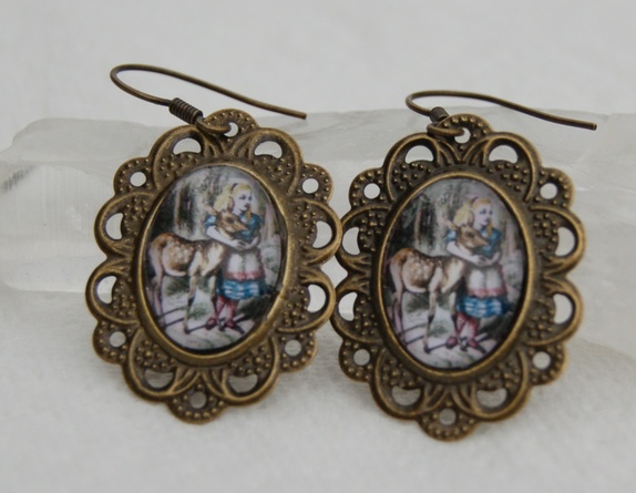 Øredobber i vintagestil med motiv av Alice i Eventyrland som holder rundt et dådyr. Disse er virkelig søte! Messing innfatning og ørekrok.