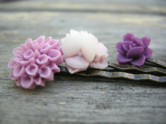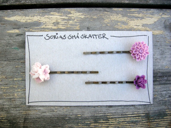 3 nydelige hårspenner i lilla toner.Hårnål i oksydert kobber med akrylblomster.Limet er profesjonelt smykke lim og etterpå lagt i herder. Hver spenne måler ca 5,5 cm.