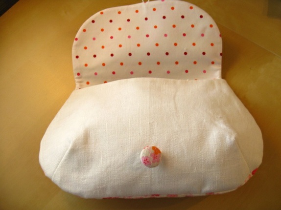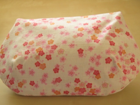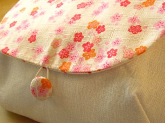 Laget grov hvit lin med fin struktur, med bakstykke og lokk i japansk stoff (Sakura) Foret med hvit bomull med prikker i matchende farger.
