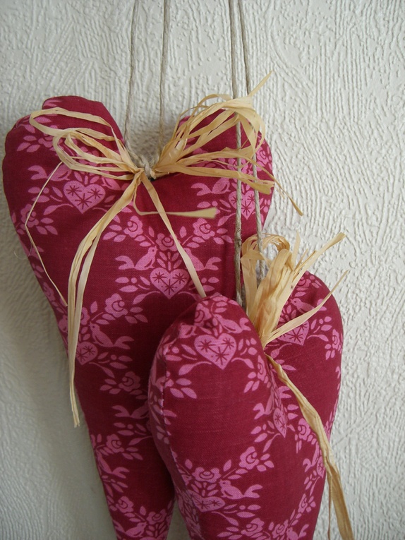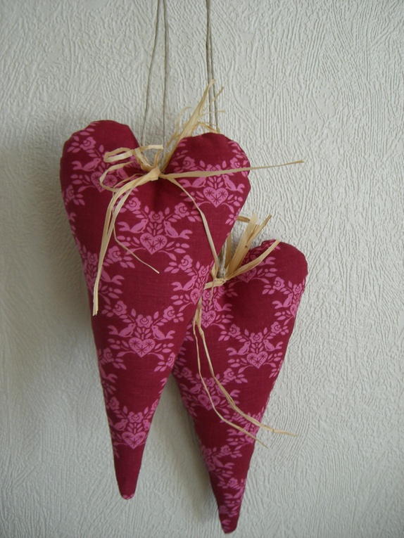 Sydd hjerte av mørk rosa bommullsstoff.Str. 12x22 cm. Pyntet med bånd. Prisen gjelder for 2 stk..