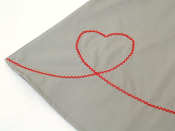 Kjolen er pyntet med en bred, rød kroklisse over brystet, røde knapper og en smal, rød kroklisse som slynger seg som et hjerte over hele skjørtets forside.