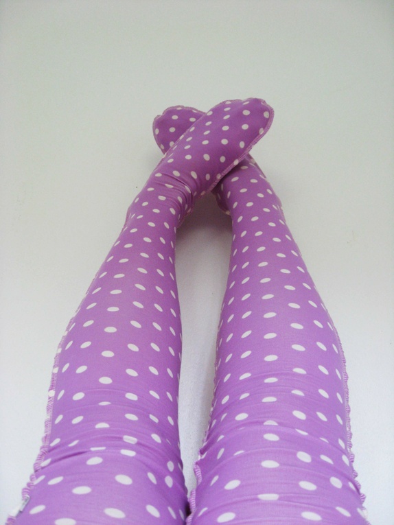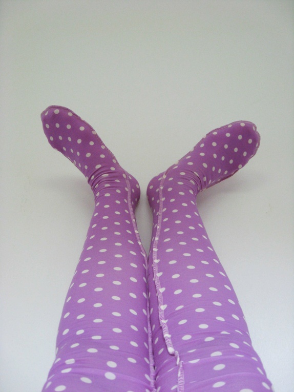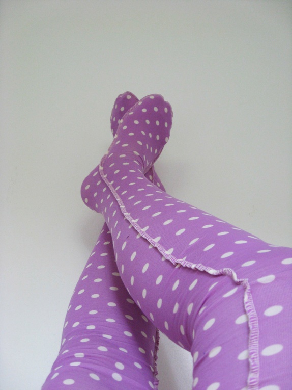 Lange, deilige knestrømper som rekker godt over knærne. De er sydd i en lys lilla bomullsjersey med små hvite prikker i hvitt. Knestrømpene er fasongsydd med en dekorativ overlocksøm på utsiden og i avslutningskanten oppe. De finnes i 2 størrelser: 36-38 og 39-41.