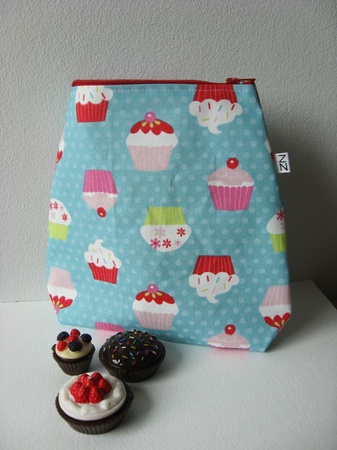 Mellomstor pung med 15 cm glidelåsåpning. Pungen er sydd i et turkis plastbelagt bomullsmateriale med duse prikker og deilige muffins i spreke farger og en rød glidelås.