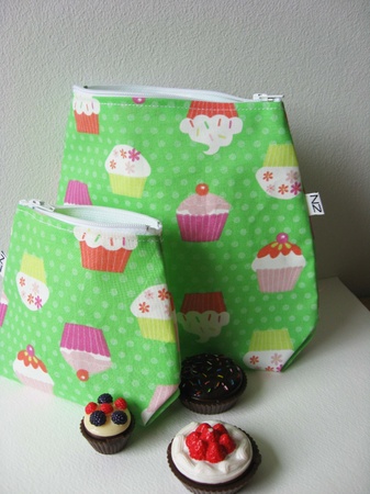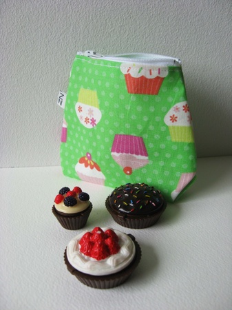 Liten pung med 10 cm glidelåsåpning. Pungen er sydd i et lyst grønt plastbelagt bomullsmateriale med små duse prikker og fristende muffins i spreke farger og en hvit glidelås.