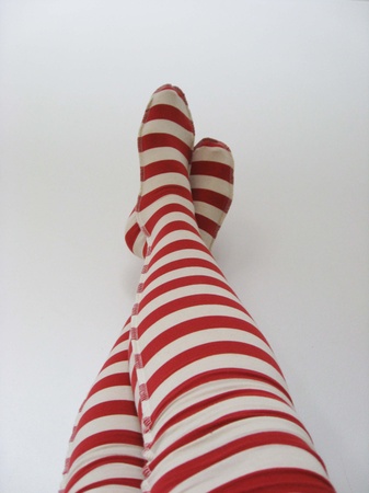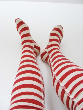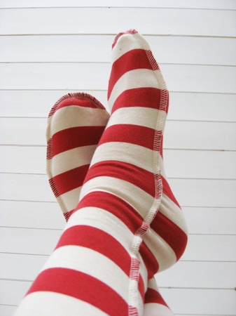 Lange, deilige knestrømper som rekker godt over knærne. De er sydd i stripete bomullsjersey i hvitt og rødt. Knestrømpene er fasongsydd med en dekorativ overlocksøm på utsiden. De finnes i 2 størrelser: 36-38 og 39-41.