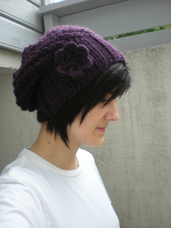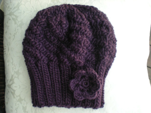 Strikket lue i en av høstens mange vakre lilla farger, i Easy garn fra Sandnes Garn, 100% Australsk Merino ull. Heklet blomst som kan tas av, da denne er laget som en brosje med nål bak.