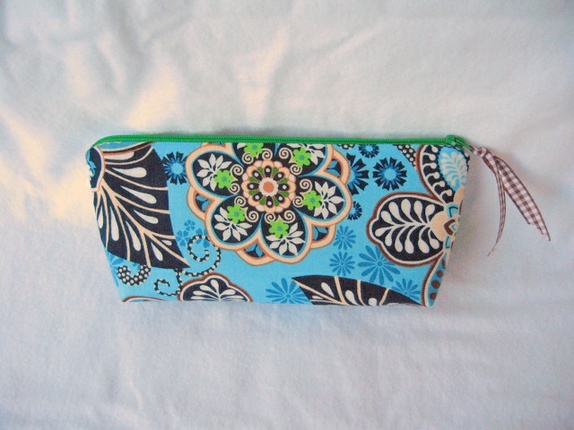 Et lite penal sydd i et lekkert stoff i bomull med mønster i blått, grønt og brunt.