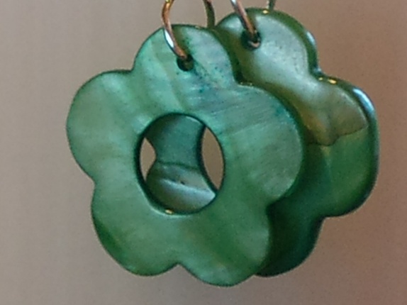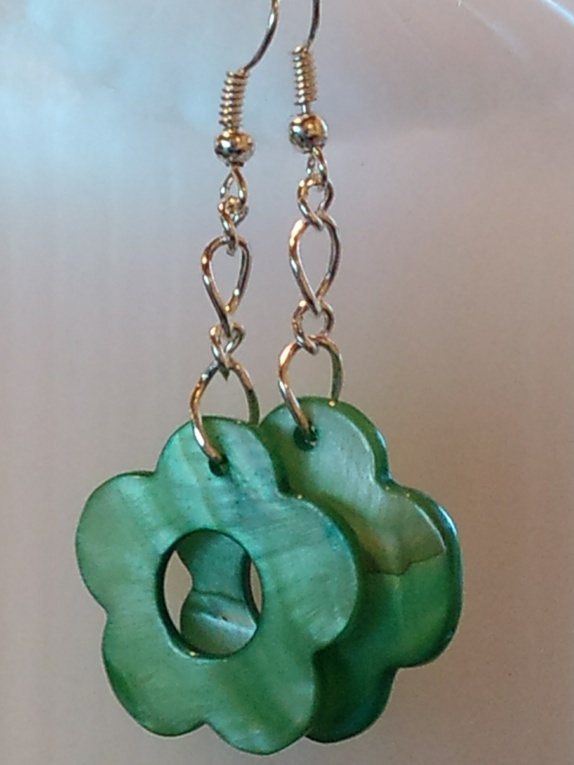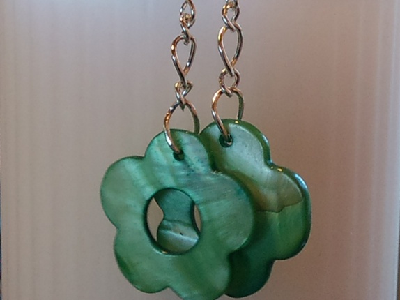 Ørekroker laget av perlemorskjell, formet som en blomst, og festet i litt lenke.