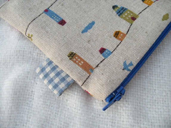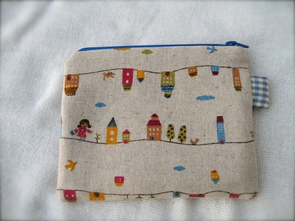 Pung laget i japansk stoff i lin og bomull. Foret med et smårutete stoff i blå og hvit.