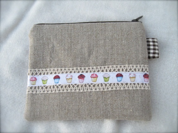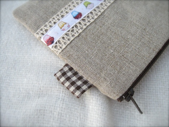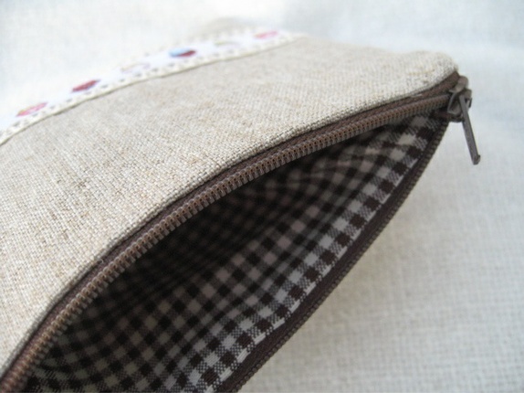 Pung laget i grov struktur lin. Foret med et smårutete stoff i brunt og hvit.