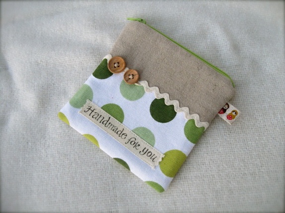 Liten pung laget i bomull og lin. Foret med bomull med grønne elefanter.