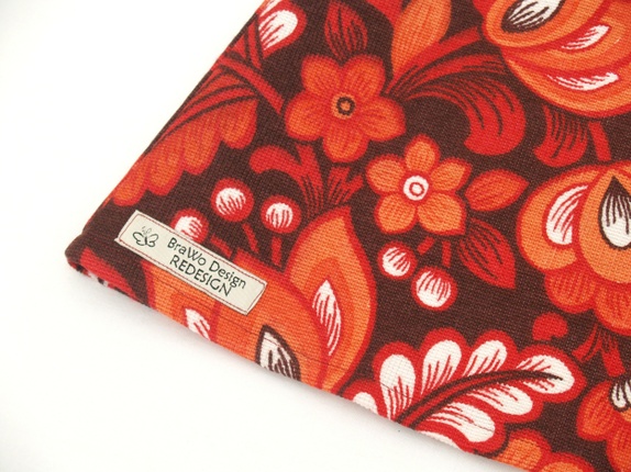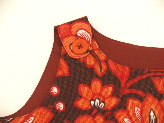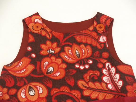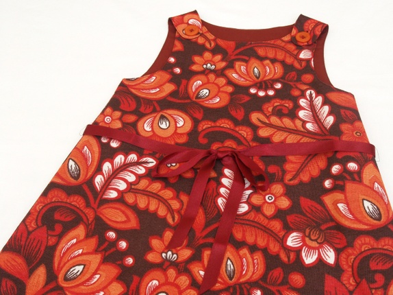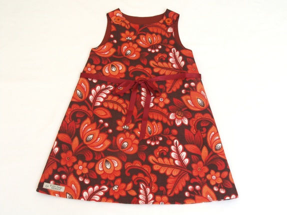 Hengslekjole sydd av en gjenbrukt duk i flotte, gyldne farger. Store orange blomster med røde og hvite detaljer slynger seg over mørk brun bunn. Burgunder satngbånd i livet. Båndet kan enkelt fjernes hvis man vil bruke kjolen uten. Kjolens overdel er foret med ensfarget burgunderrødt bomullsstoff. Orange knapper.