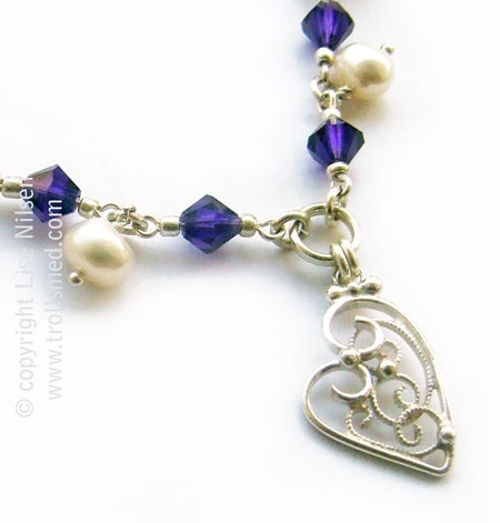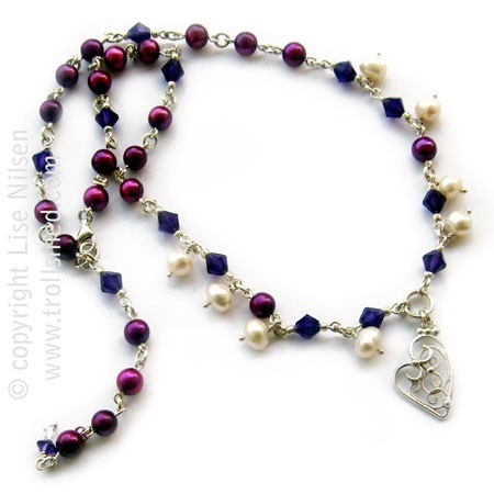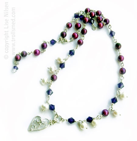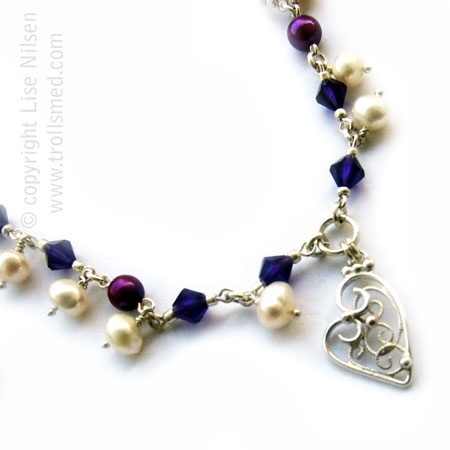 Håndlaget filigran og ferskvannsperler og glassperler. 925 sølv.