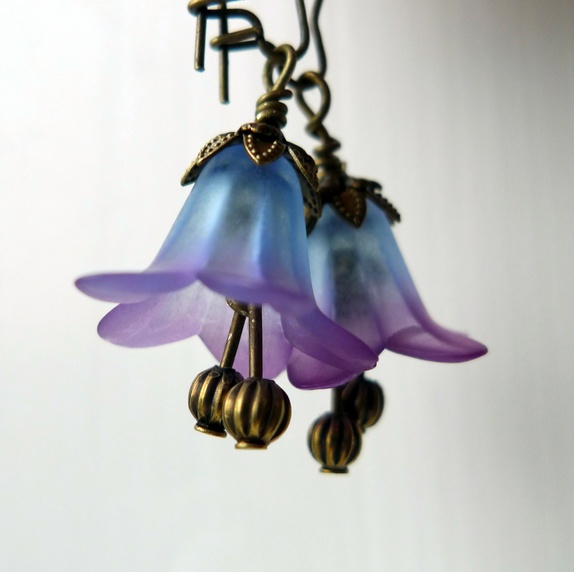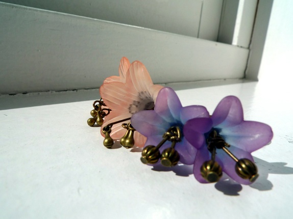 Selve blomsterklokkene er laget i 'lucite' som ser ut som matt, frostet glass. Metallet er messing, som så klart er bly- og nikkelsikkert. Ørepynten måler drøye 5 cm fra topp til tå, mens selve blomsterklokkene er 1,4 cm.