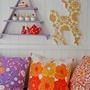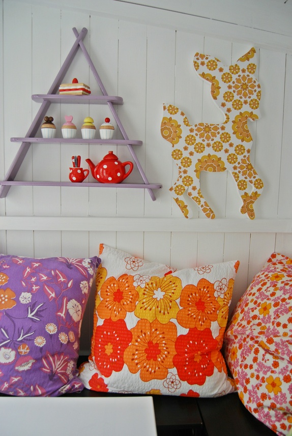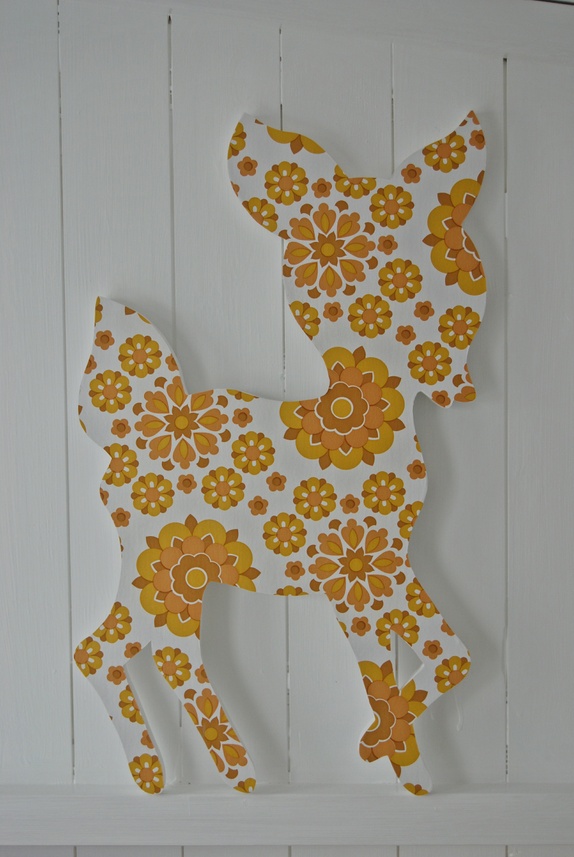 Har ein bambi utskjært i tre, pussa, kvitmalt og dekorert med vintage tapet til salgs. Bambien er tapetsert i samme tapet som bambiane på bileta.