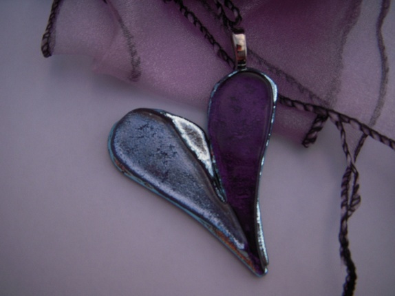 Håndlaget glasshjerte i 2 lilla-farger. Henger på skjeve. Unikt.