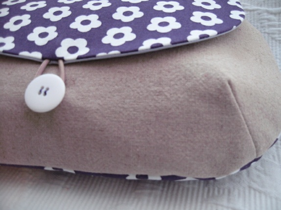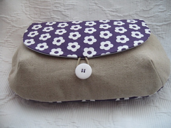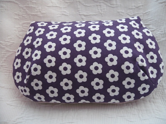 - Toalettmappe laget i lin og bomull. Hvite retro blomster på lilla bunn. Foret med bomull i lys lilla.