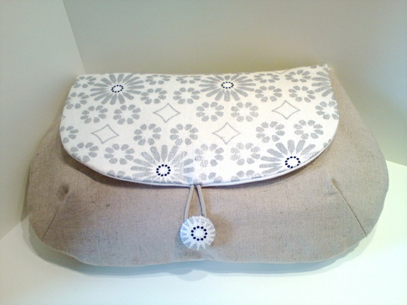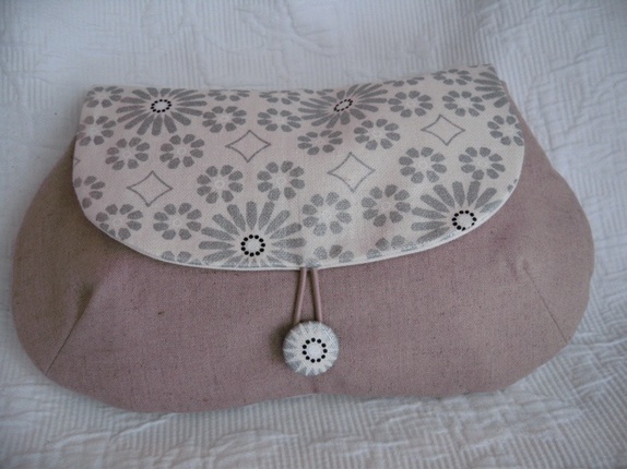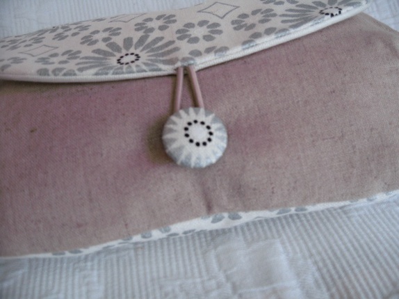 Lukkes med en knapp trukket i samme stoff som bakside og lokk.