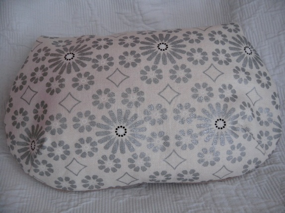 Sydd i lin og bomull. Sølvfargede blomster på hvit bunn. Foret med kremfarget bomull.
