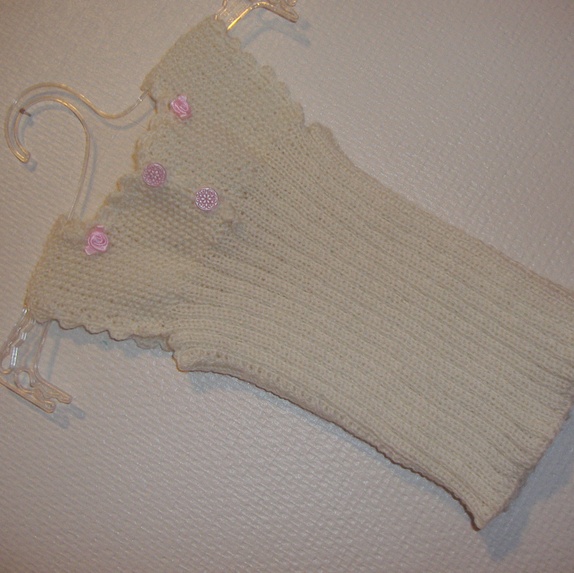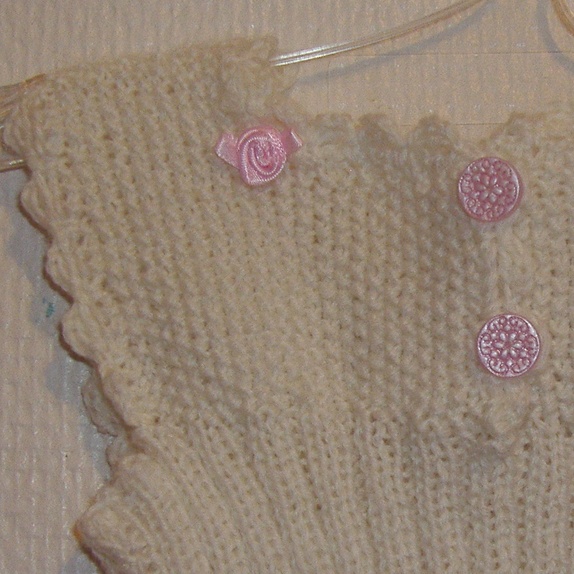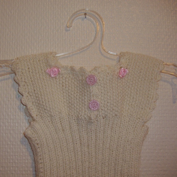 Strikket i hvitt Viking babygarn, 100% merinoull. Rosepynt, rosa knapper og heklet tungekant rundt hals/ermer. Tøyelig, ca. 0-12 mndr. Superwash maskinvask 40 gr.