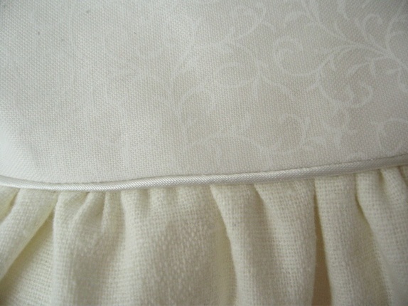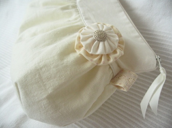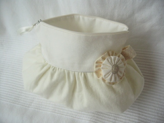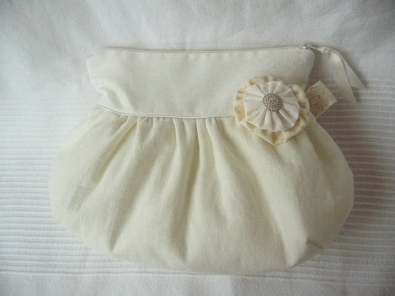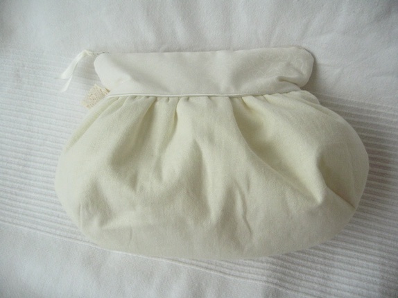 Lekker liten veske eller sminkepung i fløtefarget lin og kremfarget bomull med hvitt mønster.