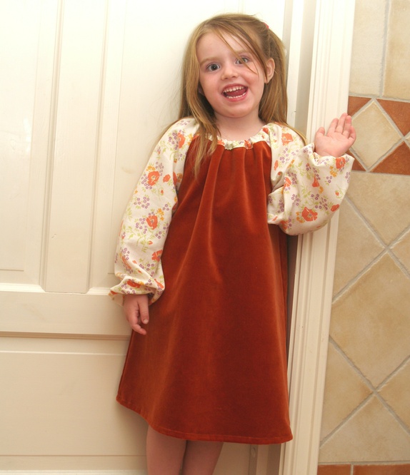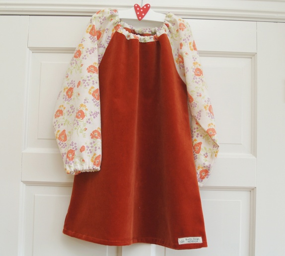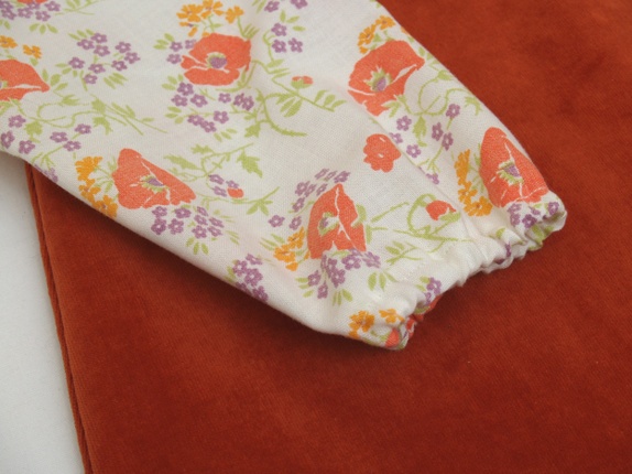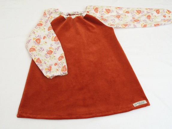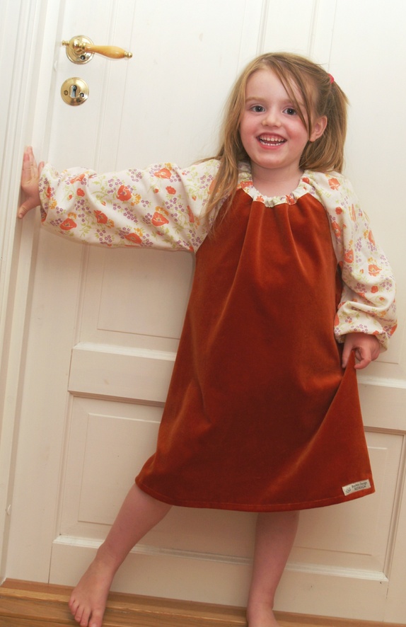 Rynkekjole med lange posearmer. Sydd av en fløyelsgardin i en dyp, varm orange farge. Armene er sydd av et mykt dynetrekk i ren bomull, med orange og lilla blomster og grønne blader på naturhvit bunn. Strikk i halsen og i armene.