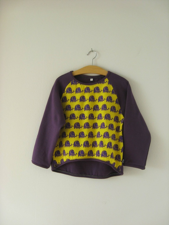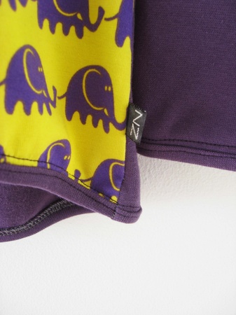 Deilig jerseygenser med raglanermer. Genseren har lilla elefanter marsjerende på gul bunn på forstykket. Ermene og bakstykket er lilla.