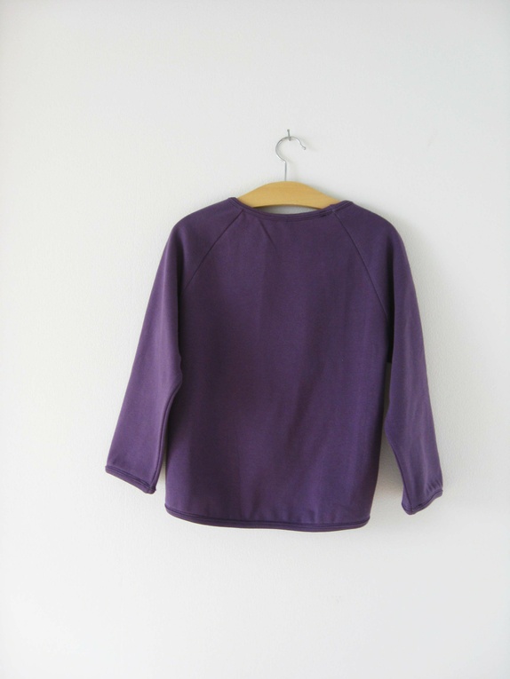 Fasongen er romslig og behagelig med en buet nederkant, litt lengre bak enn foran. Alle kantene er avsluttet med en lilla jerseykant på 1cm.