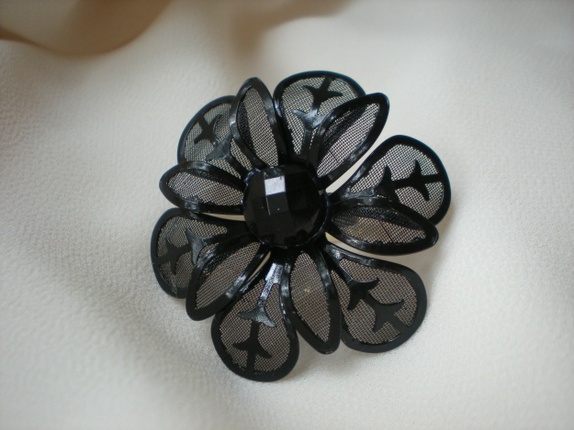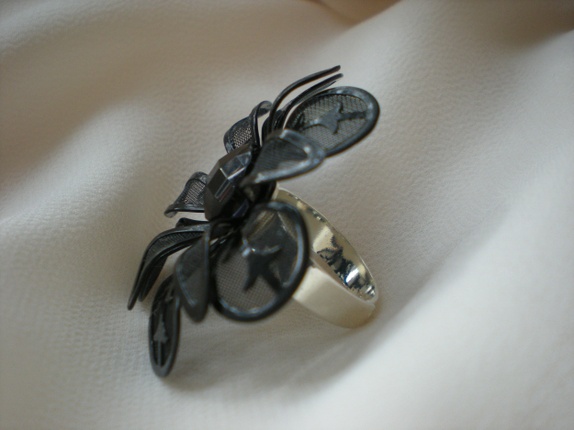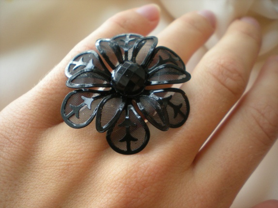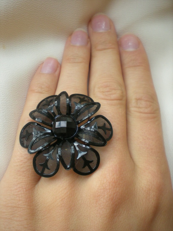 Vakker sort ring i blomsterfasong. I midten har den en glitrende, sort strass-sten.