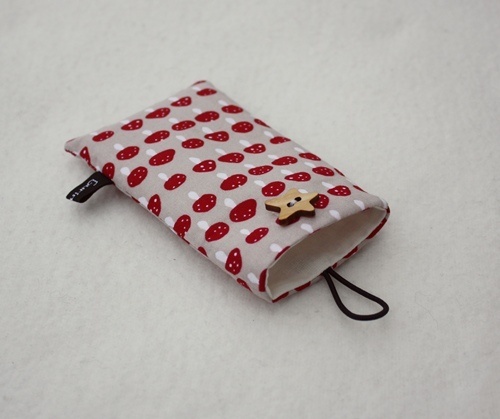 Lys beige stoff med rød sopp. Fór i naturhvitt stoff og vliselin mellom stofflagene.