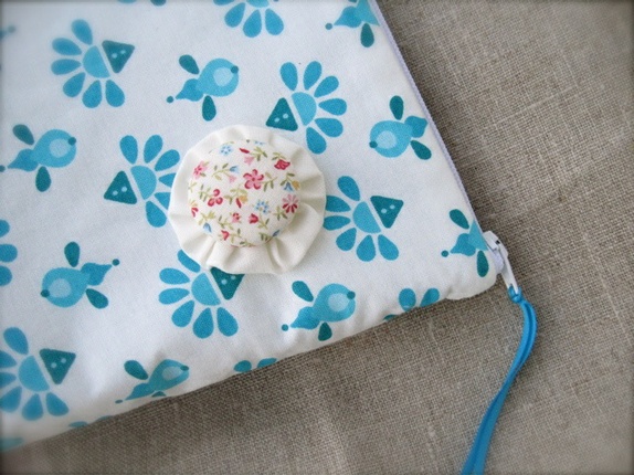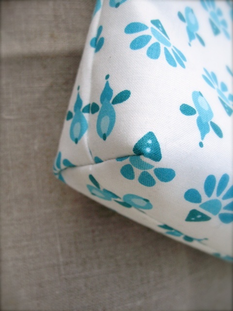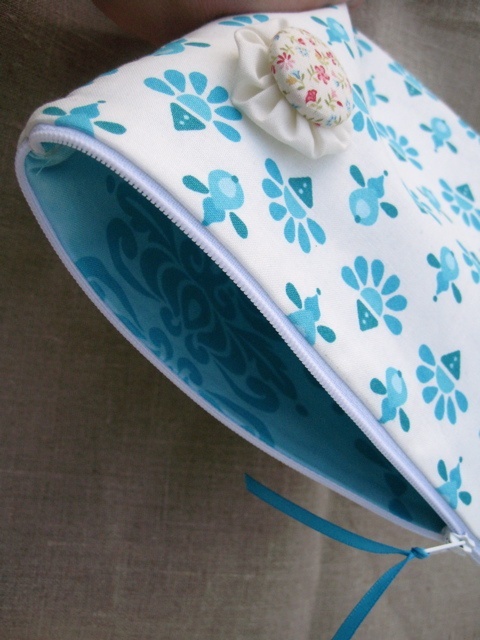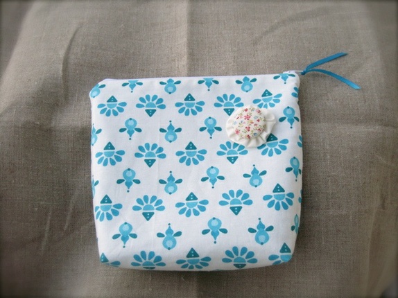 - En middels stor pung laget i et bomullstoff mønstret i turkis.