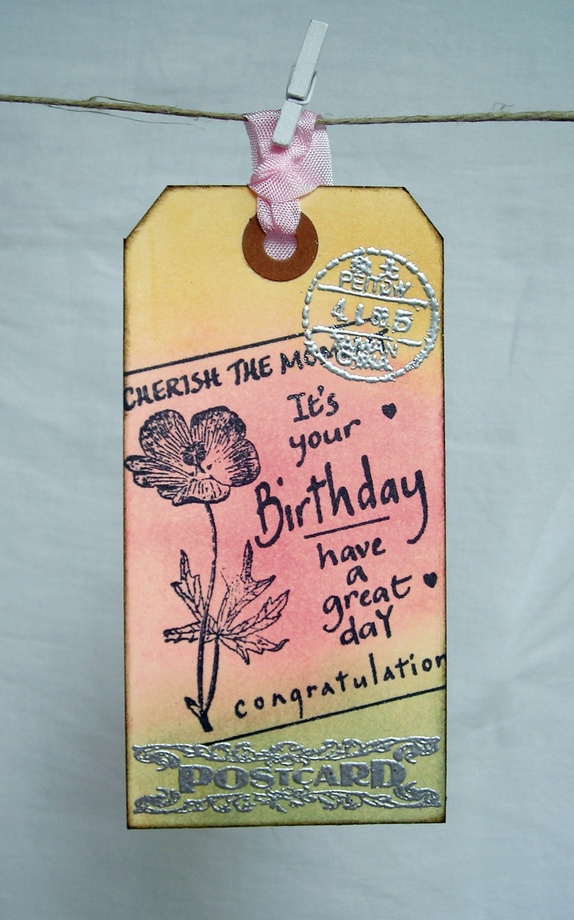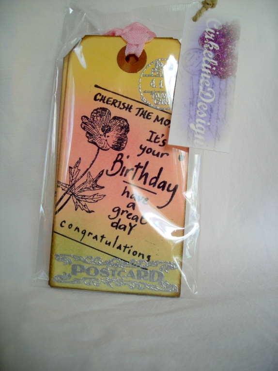 Lappene er farget i friske farger - grønt, rosa og gult. De er stemplet med et¨bursdagsstempel i sort og sølvembossede detaljer. På baksiden av lappene er det stemplet "To" og "From", og det er plass til en personlig hilsen.