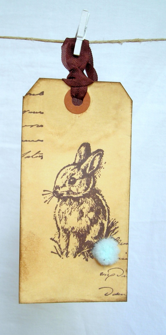 Lappene er dynket i kaffe og svertet i kantene for en "aged look". De er håndstemplet med en yndig harepus med myk, lys blå pompong-hale. På baksiden av lappene er det stemplet "til" og "fra", og det er god plass til å skrive en evt personlig hilsen.