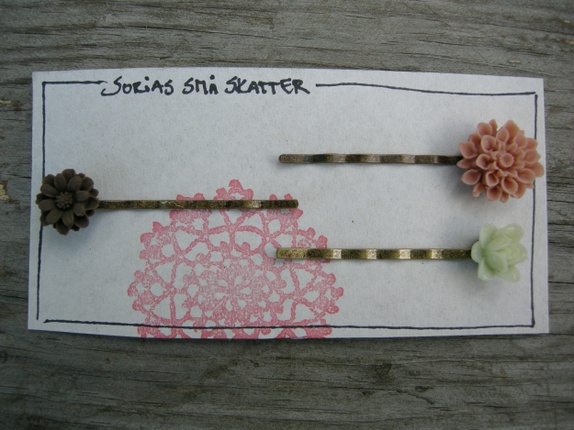 3 nydelige hårspenner i brun,sart rosa og krem.Hårnål i oksydert kobber med akrylblomster.Limet er profesjonelt smykke lim og etterpå lagt i herder. Hver spenne måler ca 5,5 cm.